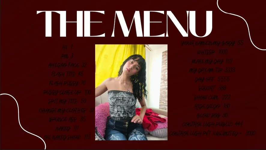 Twerk, Högklackat, Oljeshow, Striptease, Kameltå, Ahegao, Onani, Smiskning, Erotisk dans, Fingrar, Avsugning, Massage, Doggy style, Dildo eller Vibrator, Rökning, Förnedring, Orgasm, Cowgirl, Spruta